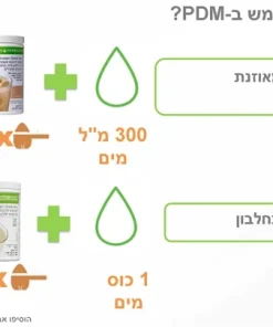 Protein Drink Mix (PDM) הוא אבקה להכנת משקה על בסיס חלבון, נטול סוכר בטעם וניל שמסייע בהגדלת צריכת החלבון היומית. מתאים לצמחונים. השתמשו ב-PDM כבסיס יחד עם פורמולה 1 ומים לארוחה טעימה ומשביעה מבלי להשתמש בחלב. לחילופין, השתמשו בו כחטיף עשיר בחלבון – רק הוסיפו מים ונערו.